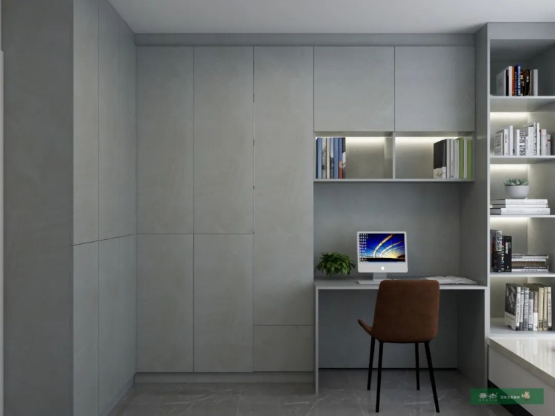 书房设计简洁舒适,不添一丝冗杂物品。一柜到顶整墙式书柜格外惹眼,简约中透着大气,书桌的线条也极为简单,处处展现随性的美感。
