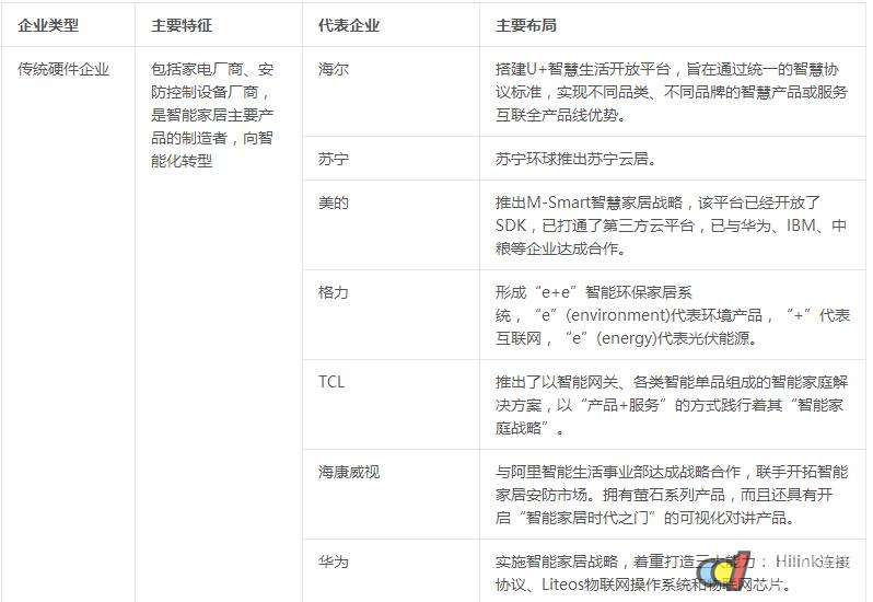 从企业层面来说,传统家电巨头海尔、美的、格力等,均积极布局,开发智能产品,同时寻求与互联网企业的跨界合作,从单体竞争逐渐转变为生态系统竞争。海尔与微软、魅族,美的与华为、小米、阿里等,均已达成战略合作,在资本、生态链、移动互联网等领域探索合作路径。同时,一些新兴创业公司兴起,多瞄准智能家电、智能插座、路由上网设备、照明系统、娱乐设备、健康健身设备、安防系统等单品进入市场,不过这些企业实力较弱,很多仅是昙花一现。