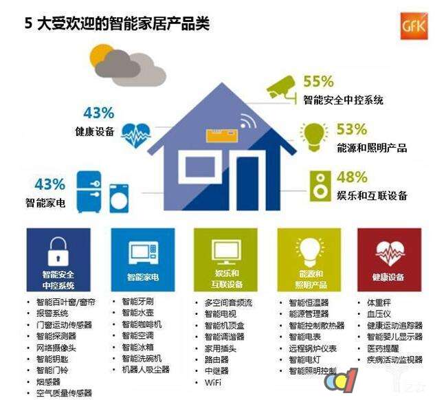 智能家居产品更加细分化 智能家居产品越来越丰富,其中受欢迎程度最高的五大类产品分别是智能安全中控系统、能源和照明产品、娱乐和互联设备、健康设备、智能家电。