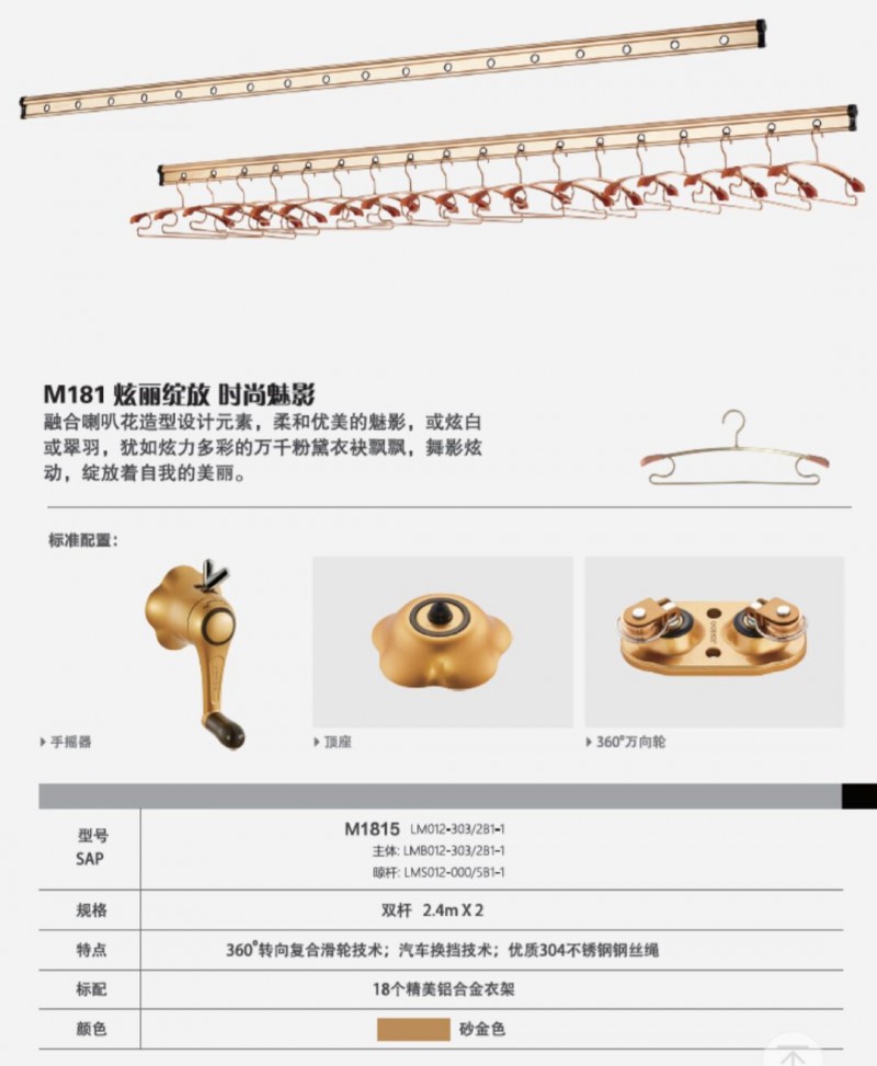 JOMOO九牧炫彩手摇晾衣架LM012-303 炫彩砂金手摇产品 亮银钛镁铝合金晾杆 送18个铝合金衣架 双杆:2.4米2 优质304不锈钢钢丝绳