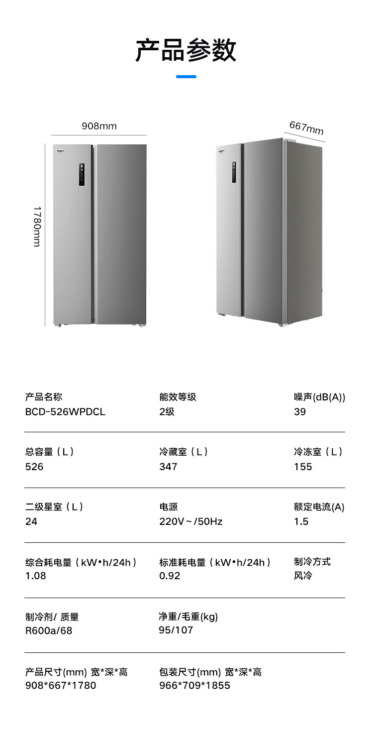晶弘526升变频风冷无霜对开门冰箱 BCD-526WPDCL