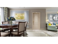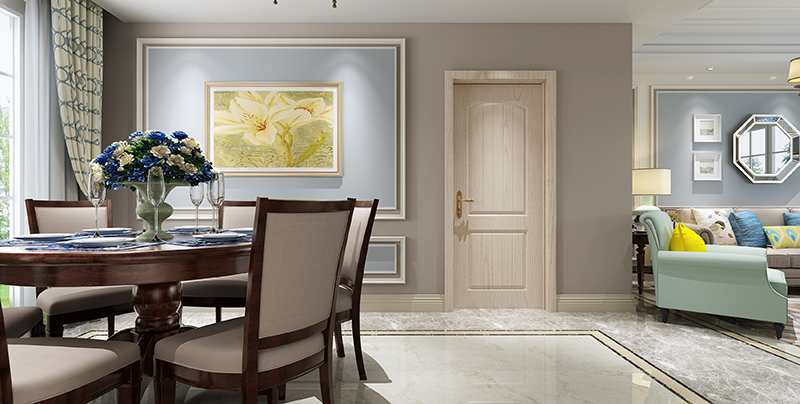 素雅的欧式简约设计,高级灰与淡蓝的墙漆、清冷的大理石地板、冷淡色系的沙发,营造大方雅致的空间,而白木纹的室内门,既呼应整体氛围,又以其特有的木纹色泽缓和了居室的清冷。