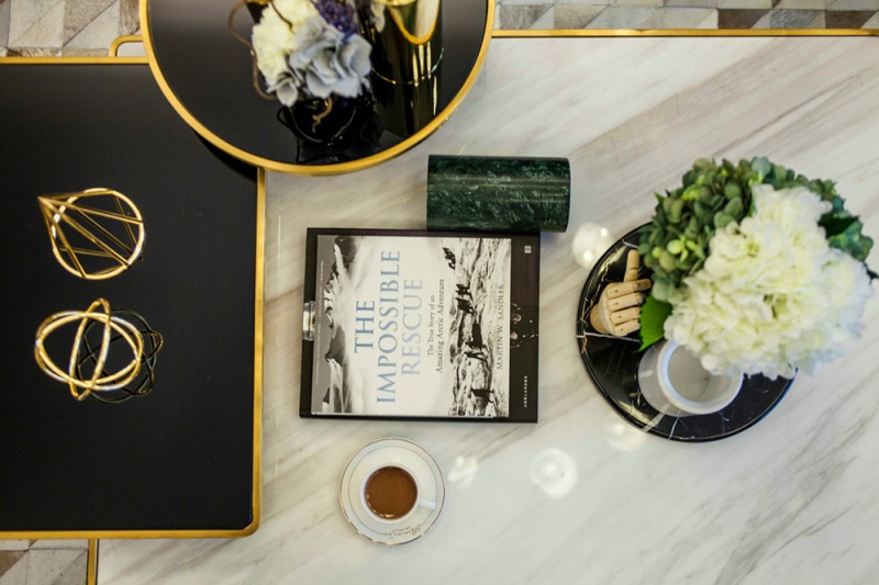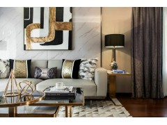 本案设计师选用高级米咖灰色为主色,摩登黑金、湖蓝为点缀色。室内装饰风格常用的装饰材料主要有木材、石材、玻璃和铁艺等,保留这些材质的原始质感同时,一股摩登气息油然而生。