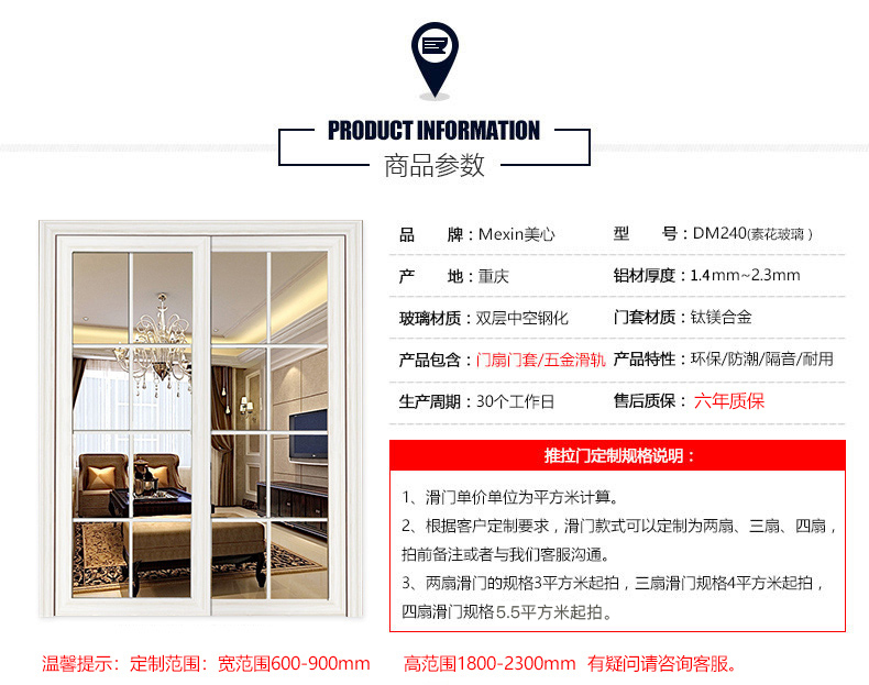 美心木门 滑门移门铝合金推拉门钛镁合金推拉玻璃门DM240
