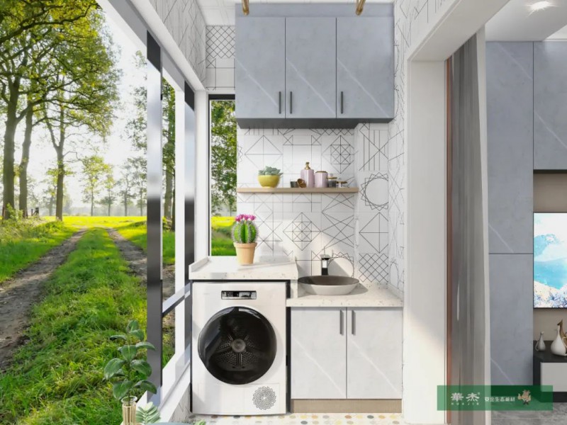 阳台做洗衣机柜,同时拥有清洗和收纳功能,且与下水管道结合,吊柜半开放设计更加简洁实用。