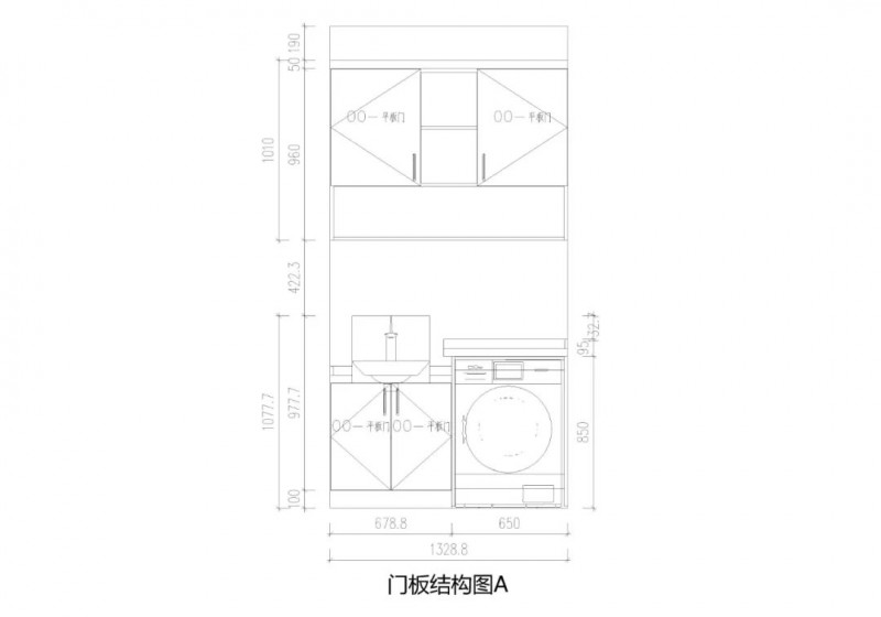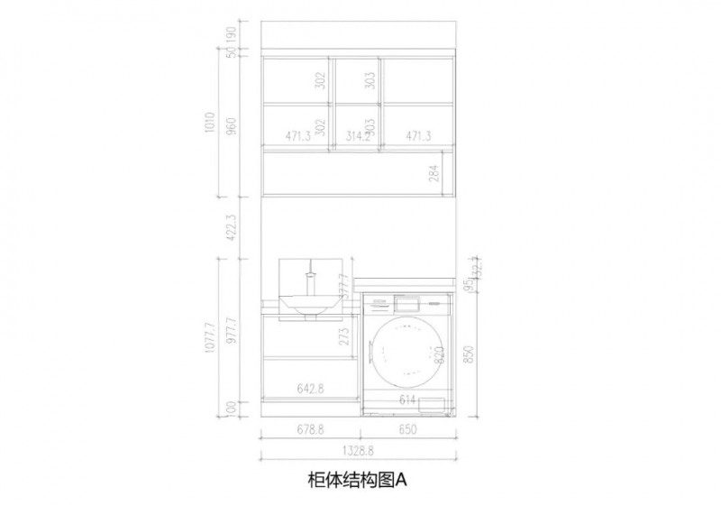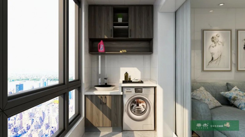 阳台做洗衣机柜,同时拥有清洗和收纳功能,且与下水管道结合,吊柜半开放设计更加简洁实用。