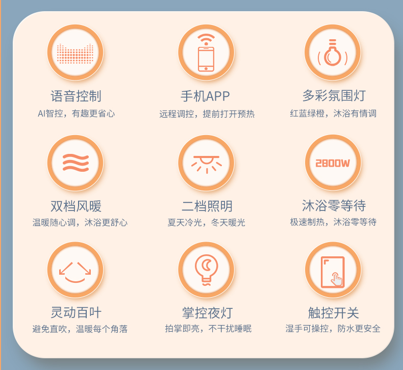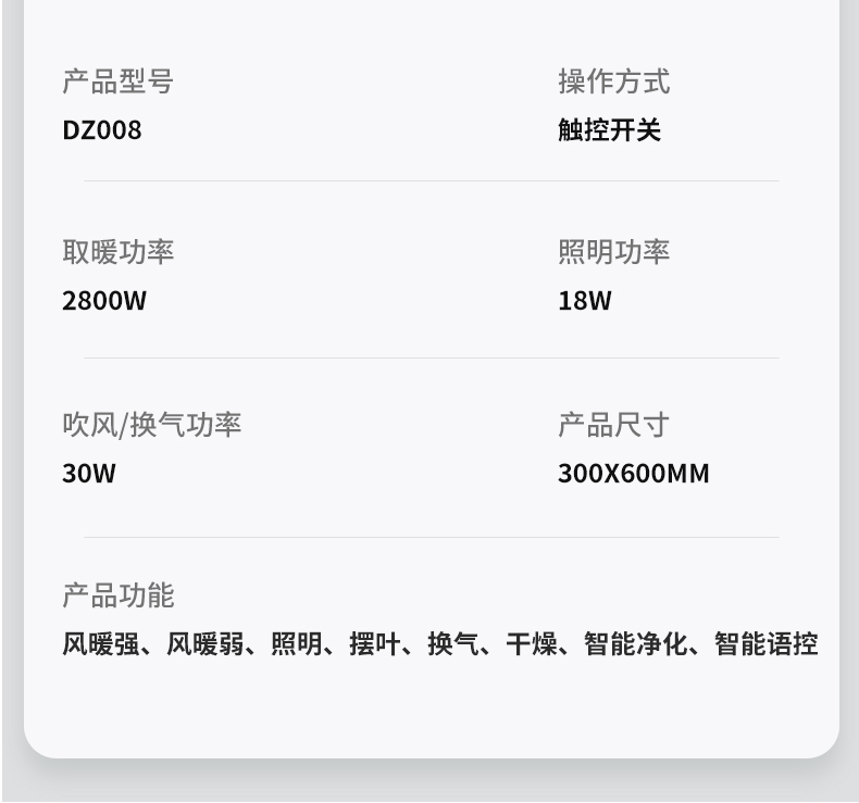 - 颜色分类: 语音智能控制【2800W速热】【智能除菌】【多彩氛围灯】 DZ008套餐【一厨一卫】浴霸DZ008+方灯 DZ008套餐1【一厨一卫】浴霸DZ008+长灯 DZ008套餐2【一厨一卫】浴霸DZ008+长灯+方灯 DZ008套餐3【一厨两卫】浴霸DZ008*2+长灯+方灯 DZ008套餐4【一厨一卫】浴霸DZ008+凉霸DL001 DZ008套餐5【全屋套餐】浴霸DZ008+凉霸DL001+长灯+方灯