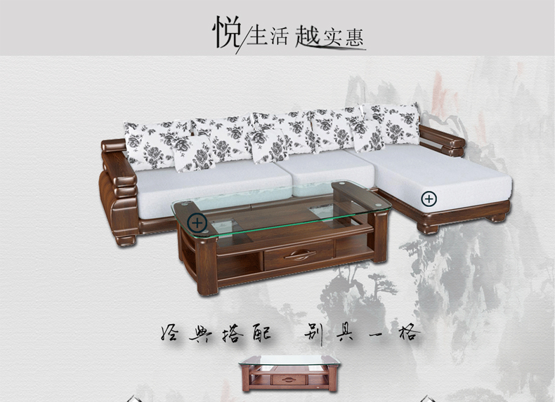 双叶家具 实木 中式现代 客厅可储物玻璃面茶几